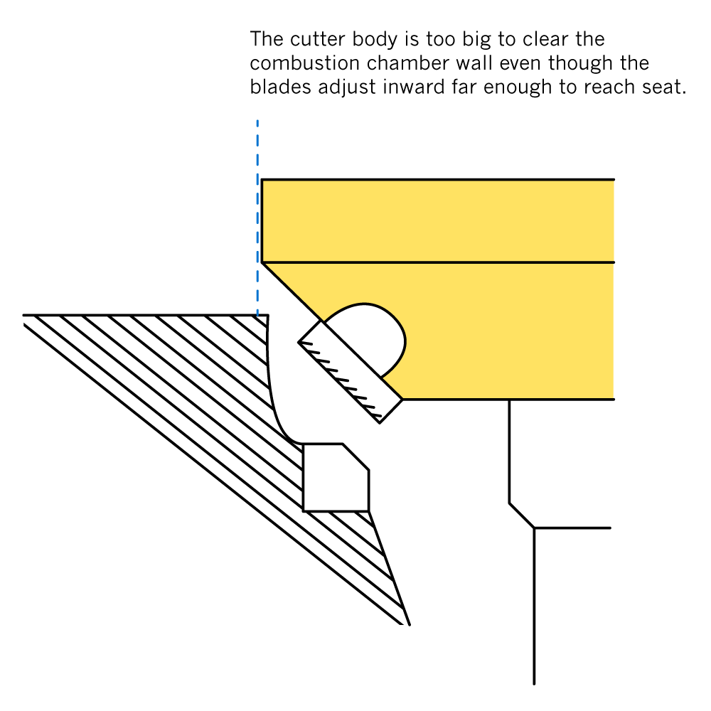 The inner operating range is a bit trickier to determine. The actual inward adjustment diameter of the blades is only meaningful when we know the cutter body will be able to fit on to the valve seat, so the amount of clearance around the valve seat area tends to be a more important factor than the actual reach of the blades. In most cases there will be some surface of the cylinder head - typically a combustion chamber wall or a cylinder head deck - that will limit the cutter size. After all, it doesn't matter how far inward the blades can extend if it's not possible to fit the cutter onto the valve seat.